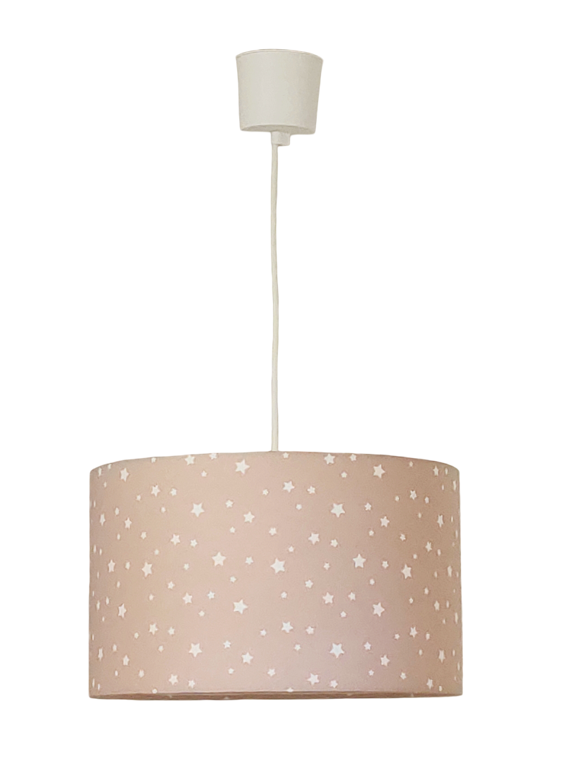 La suspension abat-jour est réalisée à partir d'une carcasse métallique finition époxy blanche recouverte de tissu 100% coton certifié OEKO TEX (sans produit chimique) motifs imprimés étoiles blanches sur fond rose nude pâle contrecollé sur un polyphane ignifugé blanc (PVC non inflammable).