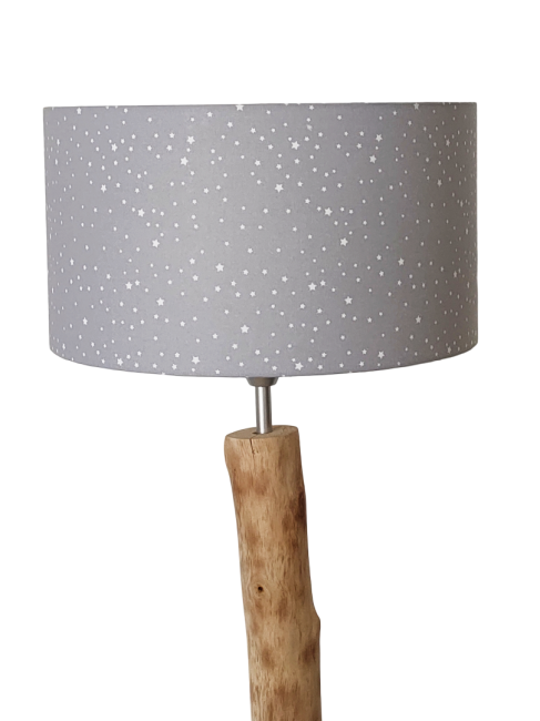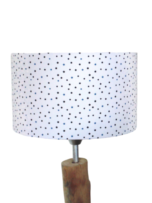 L’abat-jour est réalisé à partir d'une carcasse métallique finition époxy blanche recouverte de tissu 100% coton certifié OEKO TEX (sans produit chimique) motifs imprimés étoiles contrecollé sur un polyphane ignifugé blanc (PVC non inflammable).