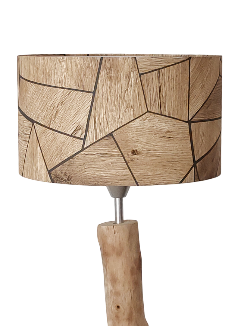 L’abat-jour est réalisé à partir d'une carcasse métallique finition époxy blanche recouverte de papier intissé imprimé motifs parquet bois chêne blond contrecollé sur un polyphane ignifugé blanc (PVC non inflammable).