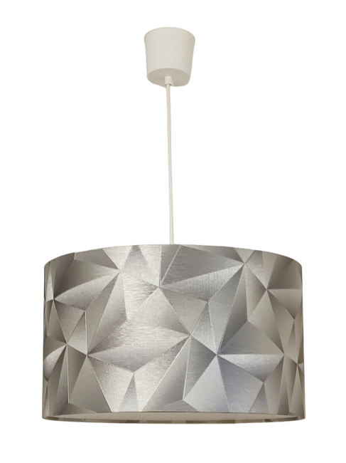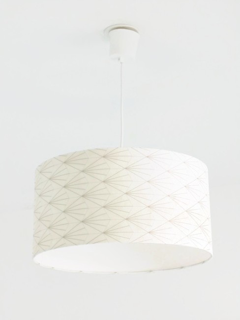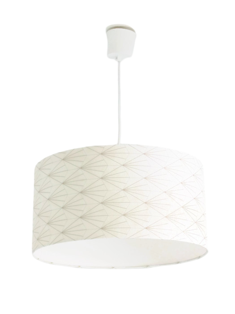 La suspension abat-jour est réalisée à partir d'une carcasse métallique finition époxy blanche recouverte de papier intissé imprimé motifs Art déco or et argent contrecollé sur un polyphane ignifugé blanc (PVC non inflammable).
