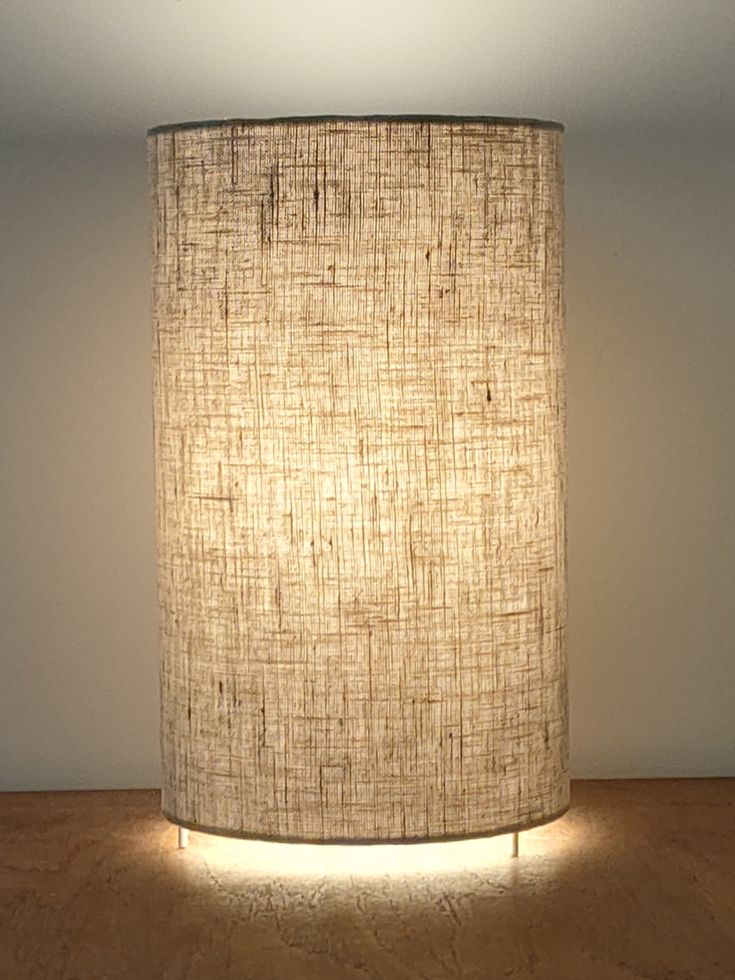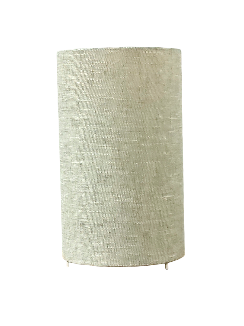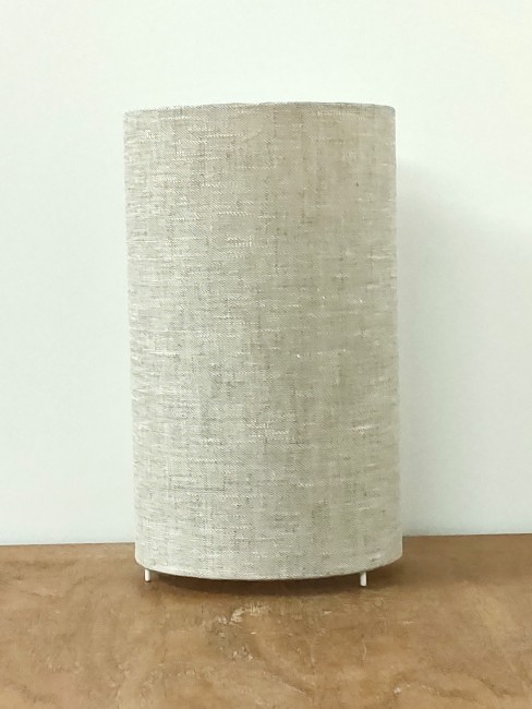 La lampe tube est réalisée à partir d'une carcasse métallique avec pieds finition époxy blanche recouverte de tissu 100% Lin contrecollé sur un polyphane ignifugé blanc (PVC non inflammable).