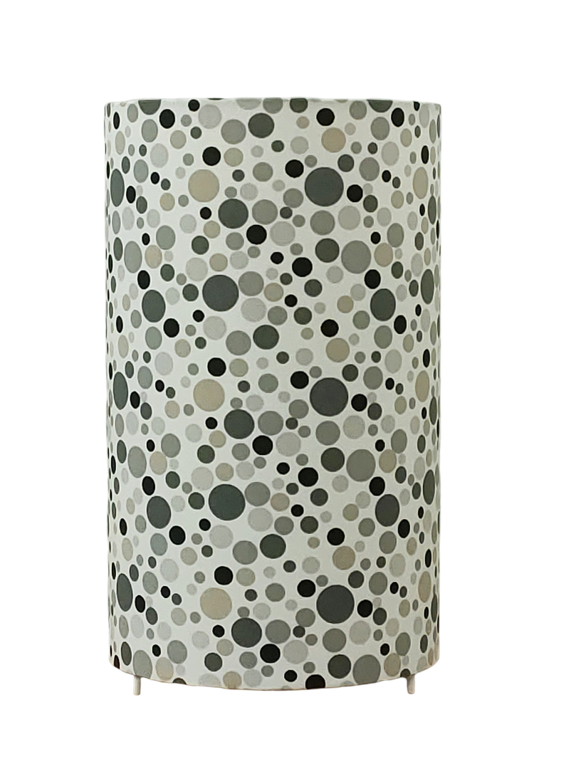 La lampe tube est réalisée à partir d'une carcasse métallique avec pieds finition époxy blanche recouverte de tissu 100% coton certifié OEKO TEX (sans produit chimique) motifs imprimés pois contrecollé sur un polyphane ignifugé blanc (PVC non inflammable).