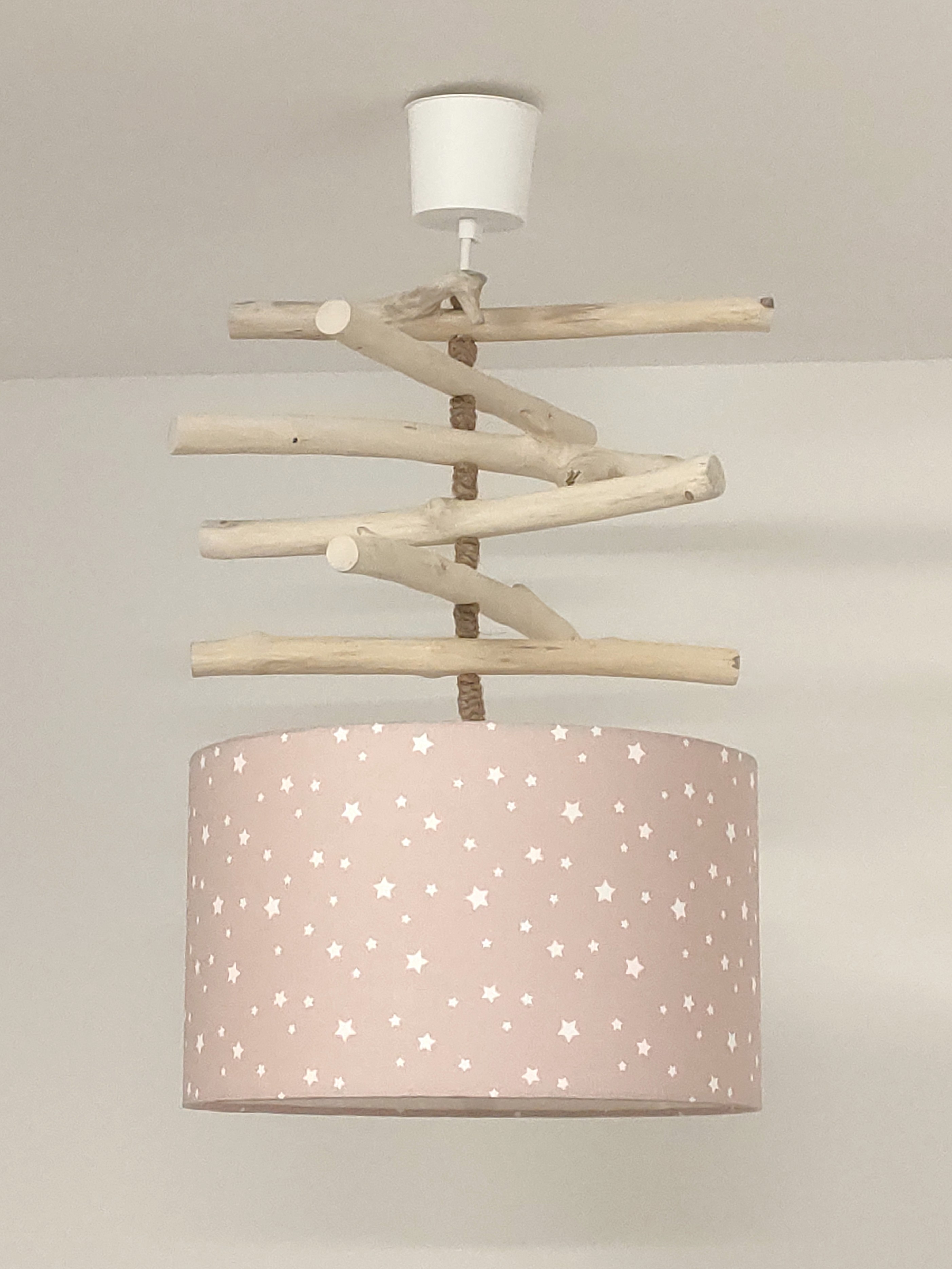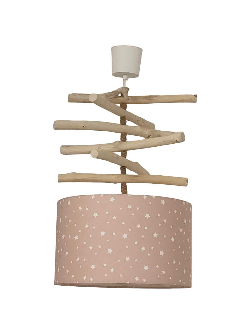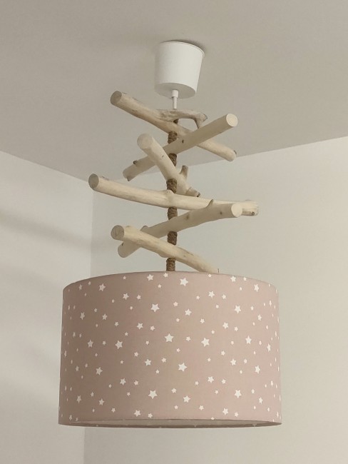 La carcasse de l'abat-jour est en métal finition époxy recouverte de tissu motifs imprimés étoiles blanches sur fond rose nude pâle coton certifié OEKO TEX (sans produit chimique) contrecollé sur un polyphane ignifugé blanc (PVC non inflammable).