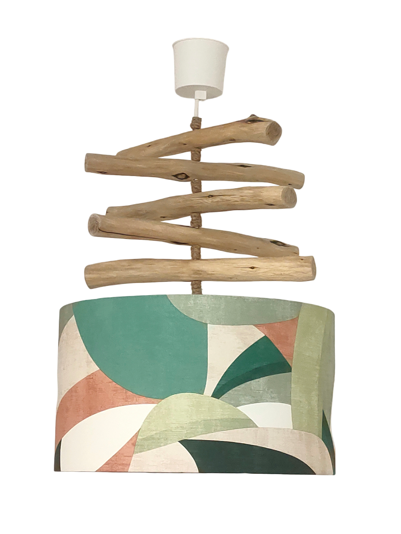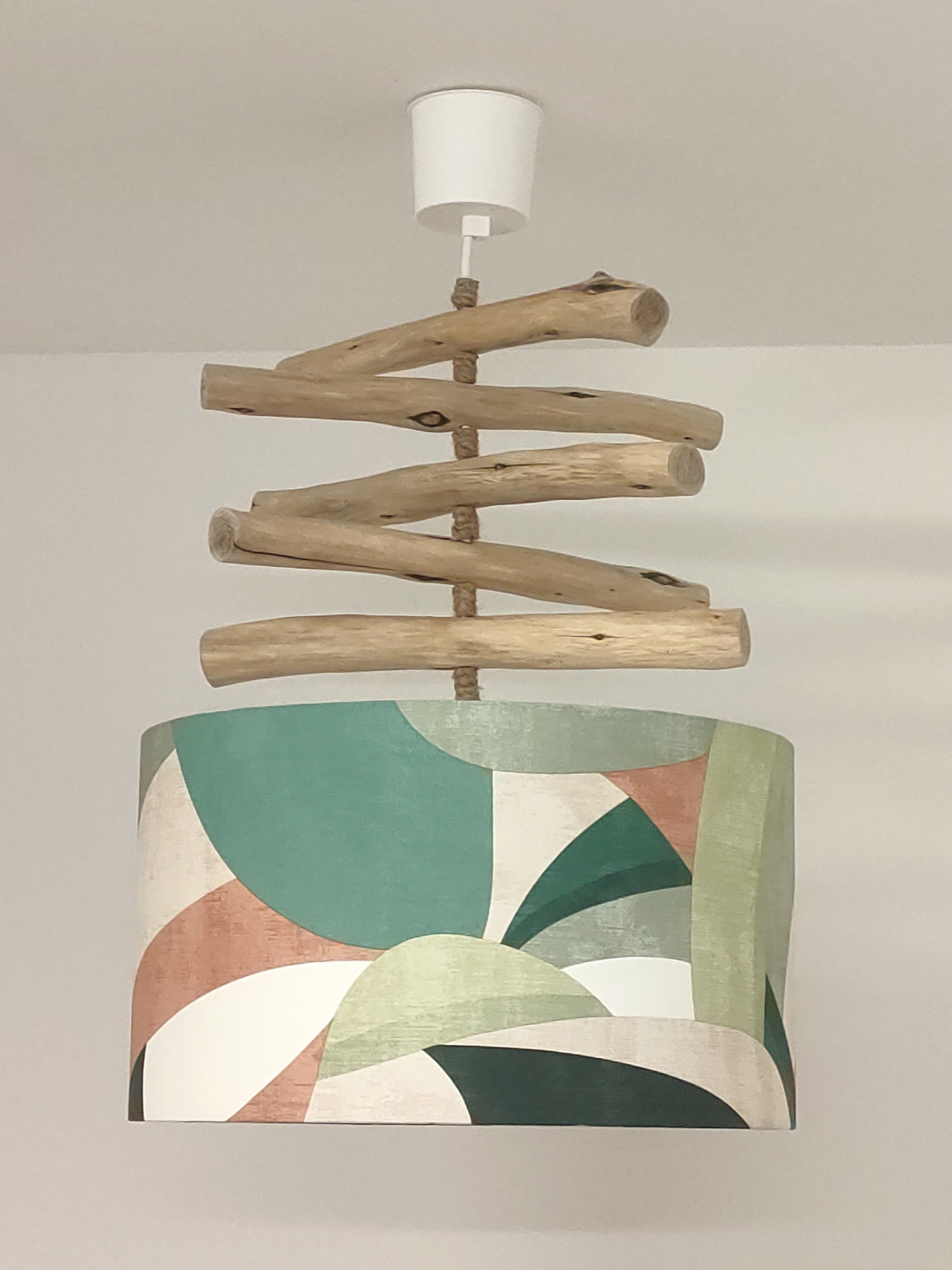 Création Artisanale Française - Lustre en bois flotté avec abat-jour cylindrique.