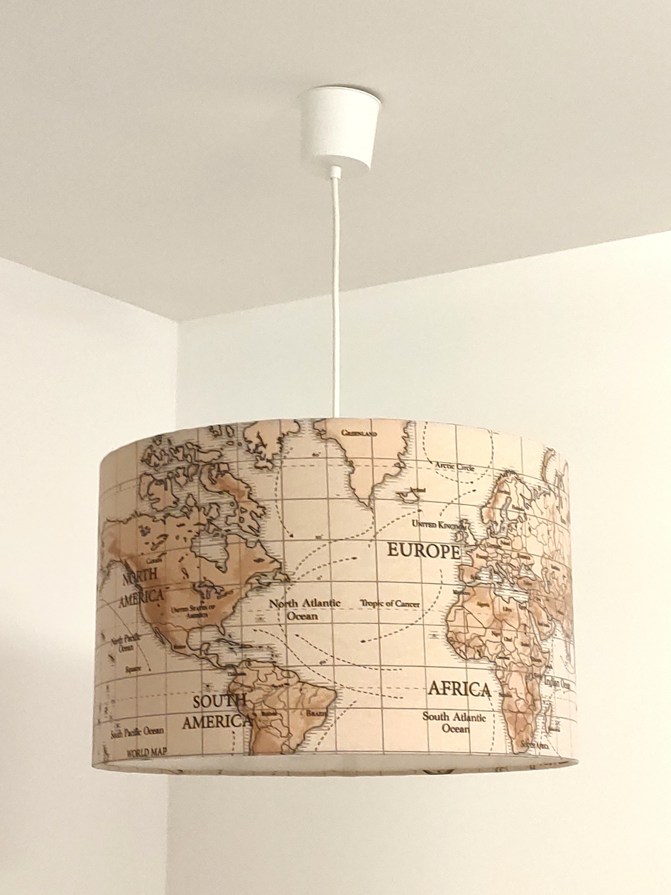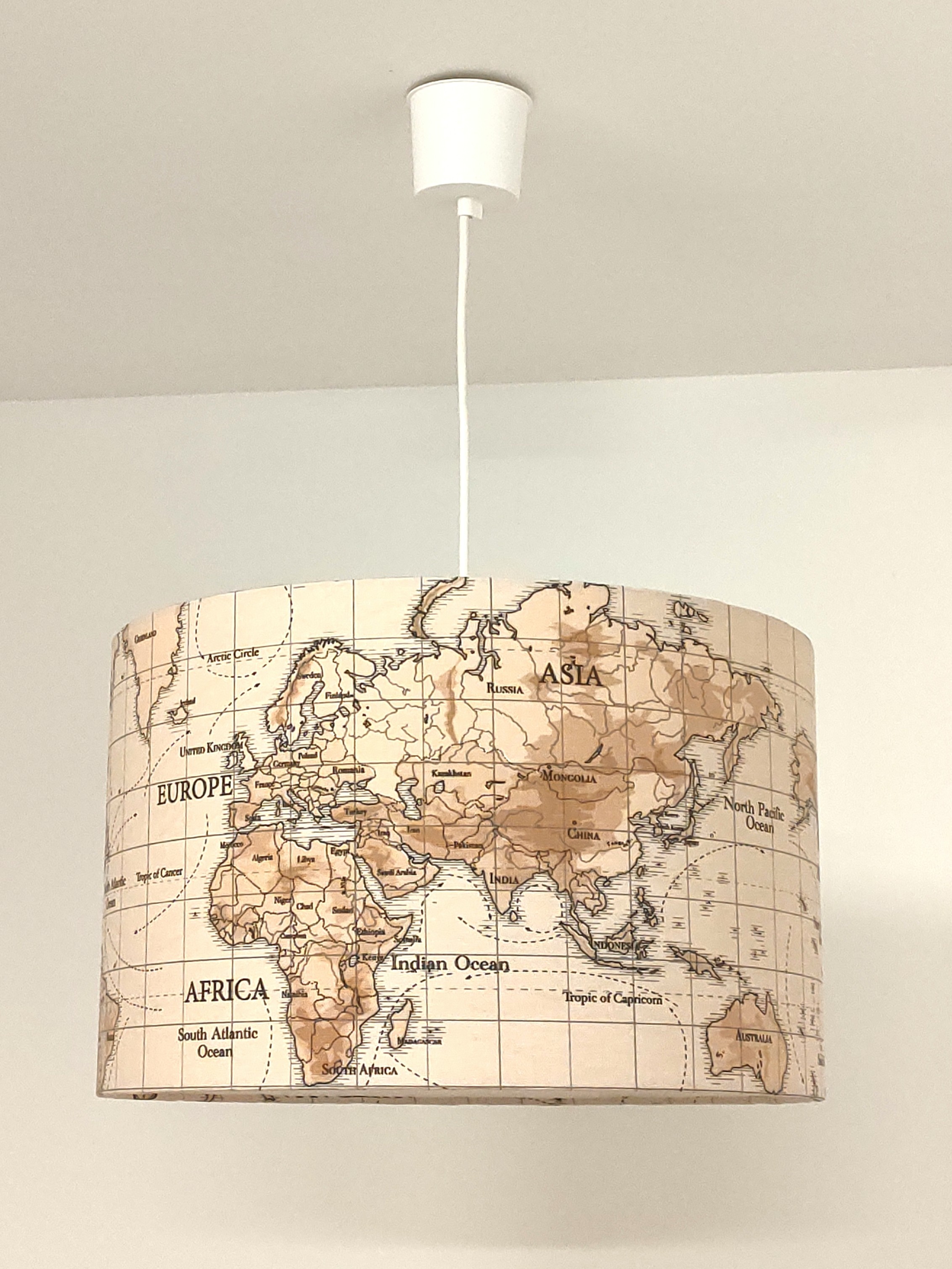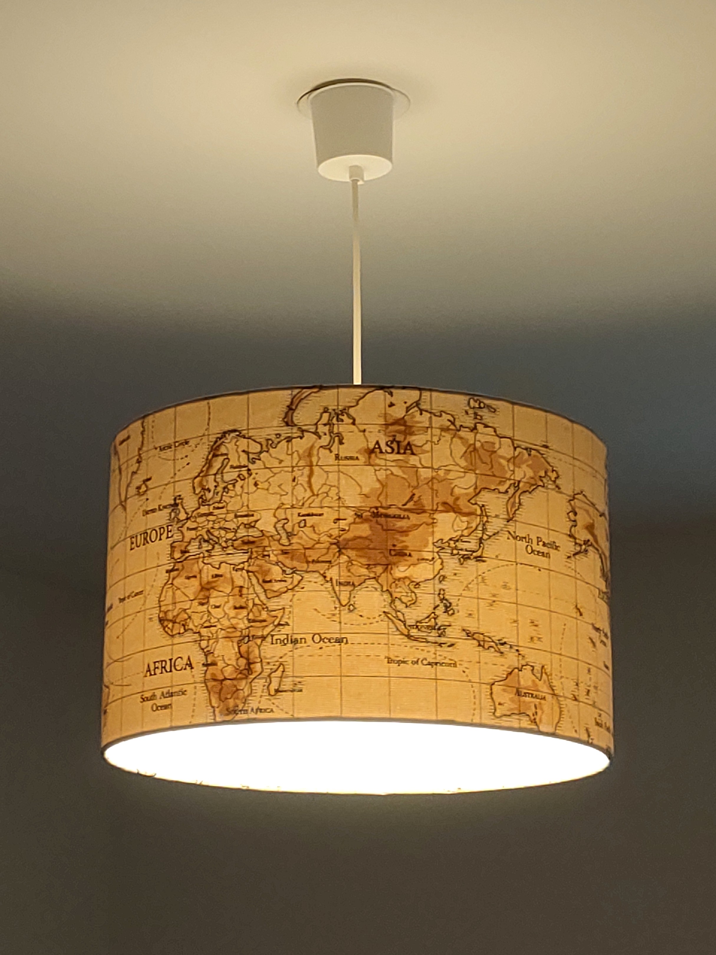 La suspension abat-jour est réalisée à partir d'une carcasse métallique finition époxy blanche recouverte de tissu 100% coton certifié OEKO TEX (sans produit chimique) motifs imprimés carte du monde contrecollé sur un polyphane ignifugé blanc (PVC non inflammable).