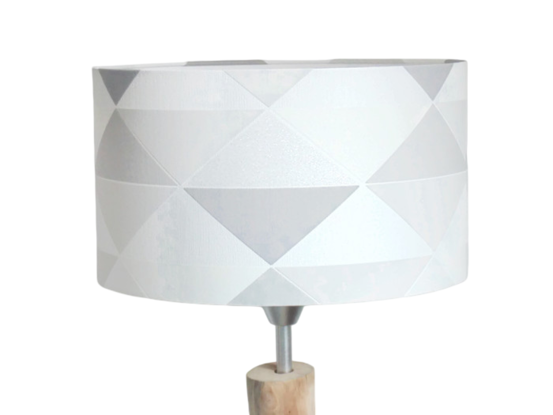 L’abat-jour est réalisé à partir d'une carcasse métallique finition époxy blanche recouverte de papier intissé imprimé motifs triangles - géométriques contrecollé sur un polyphane ignifugé blanc (PVC non inflammable).