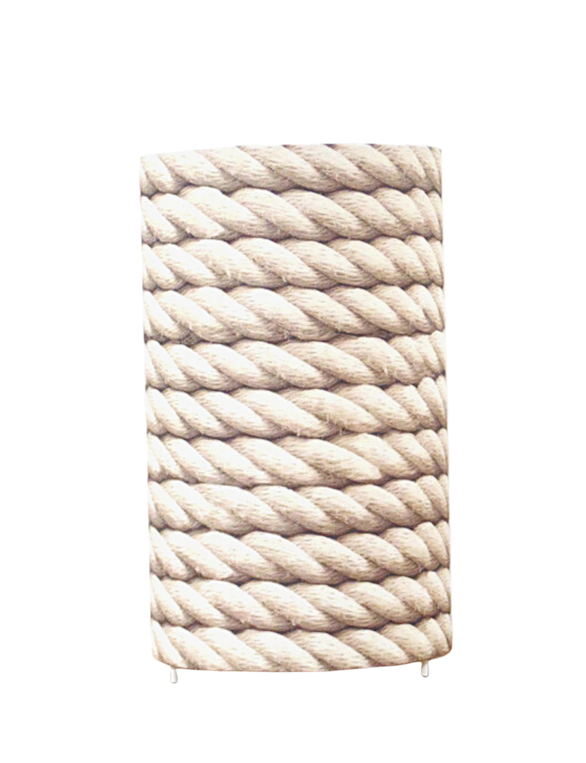 La lampe tube est réalisée à partir d'une carcasse métallique avec pieds finition époxy blanche recouverte de papier intissé imprimé motifs Cordage contrecollé sur un polyphane ignifugé blanc (PVC non inflammable).