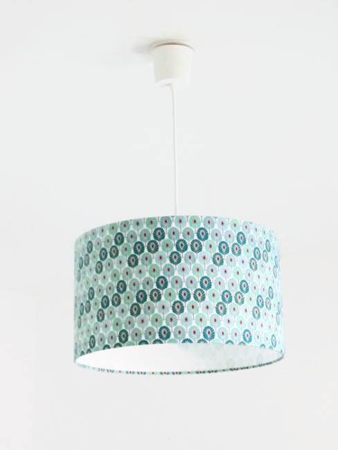 La suspension abat-jour est réalisée à partir d'une carcasse métallique finition époxy blanche recouverte de tissu 100% coton certifié OEKO TEX (sans produit chimique) motifs imprimés mini plumes de paon vertes contrecollé sur un polyphane ignifugé blanc (PVC non inflammable).