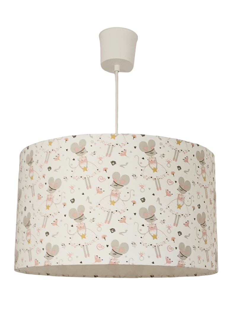 La suspension abat-jour est réalisée à partir d'une carcasse métallique finition époxy blanche recouverte de tissu 100% coton certifié OEKO TEX (sans produit chimique) motifs imprimés petites souris - princesses contrecollé sur un polyphane ignifugé blanc (PVC non inflammable).