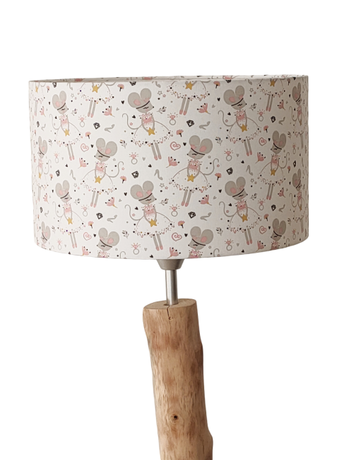 L’abat-jour est réalisé à partir d'une carcasse métallique finition époxy blanche recouverte de tissu 100% coton certifié OEKO TEX (sans produit chimique) motifs imprimés petites souris contrecollé sur un polyphane ignifugé blanc (PVC non inflammable).