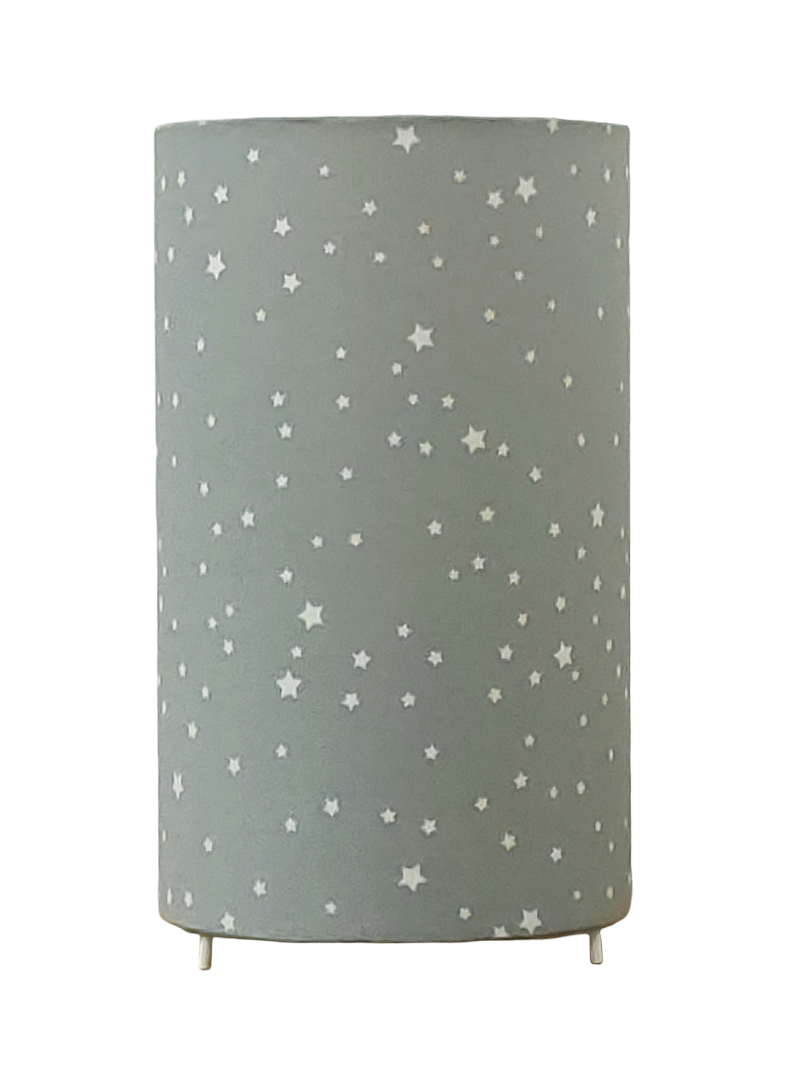 La lampe tube est réalisée à partir d'une carcasse métallique avec pieds finition époxy blanche recouverte de tissu 100% coton certifié OEKO TEX (sans produit chimique) motifs imprimés étoiles contrecollé sur un polyphane ignifugé blanc (PVC non inflammable).