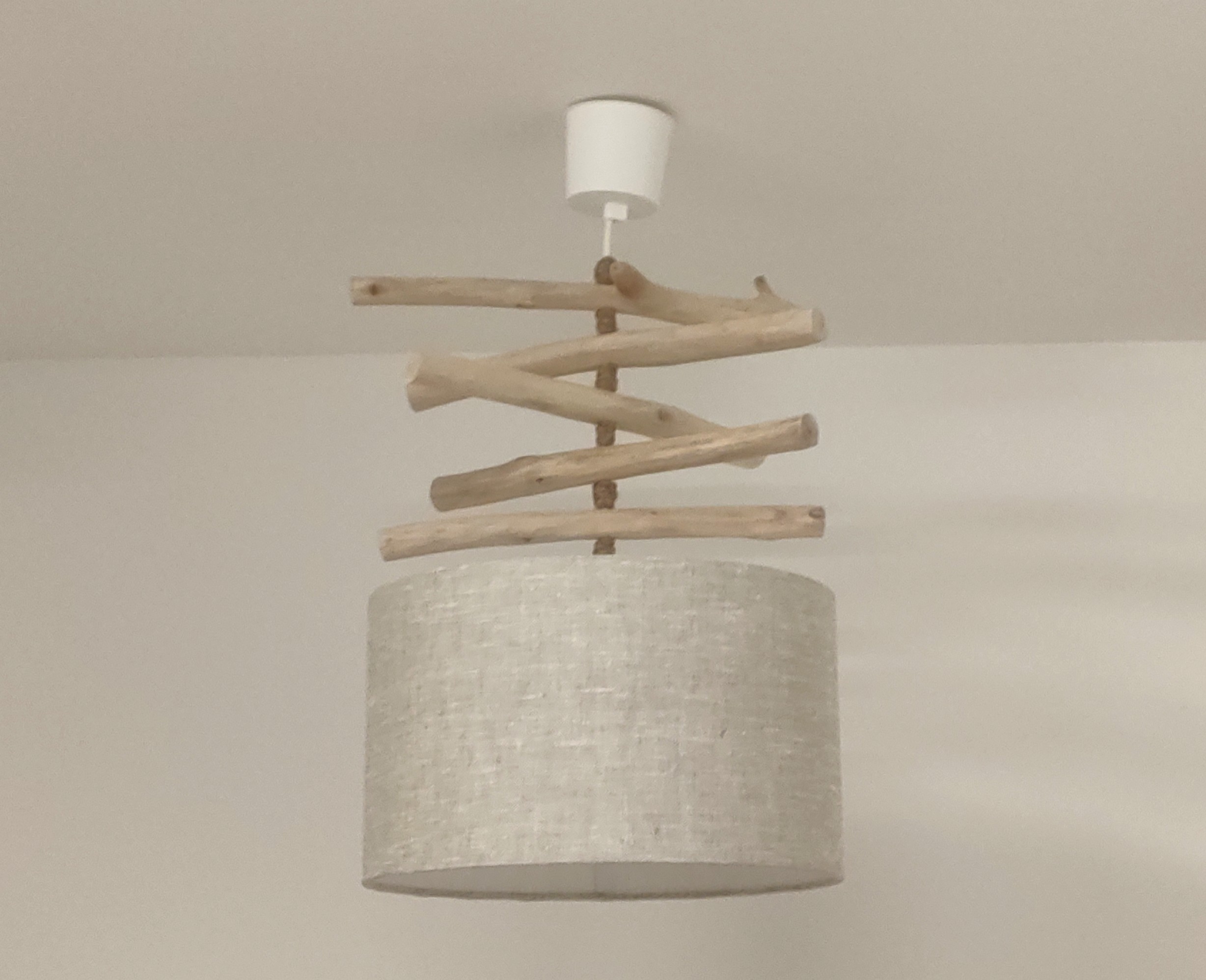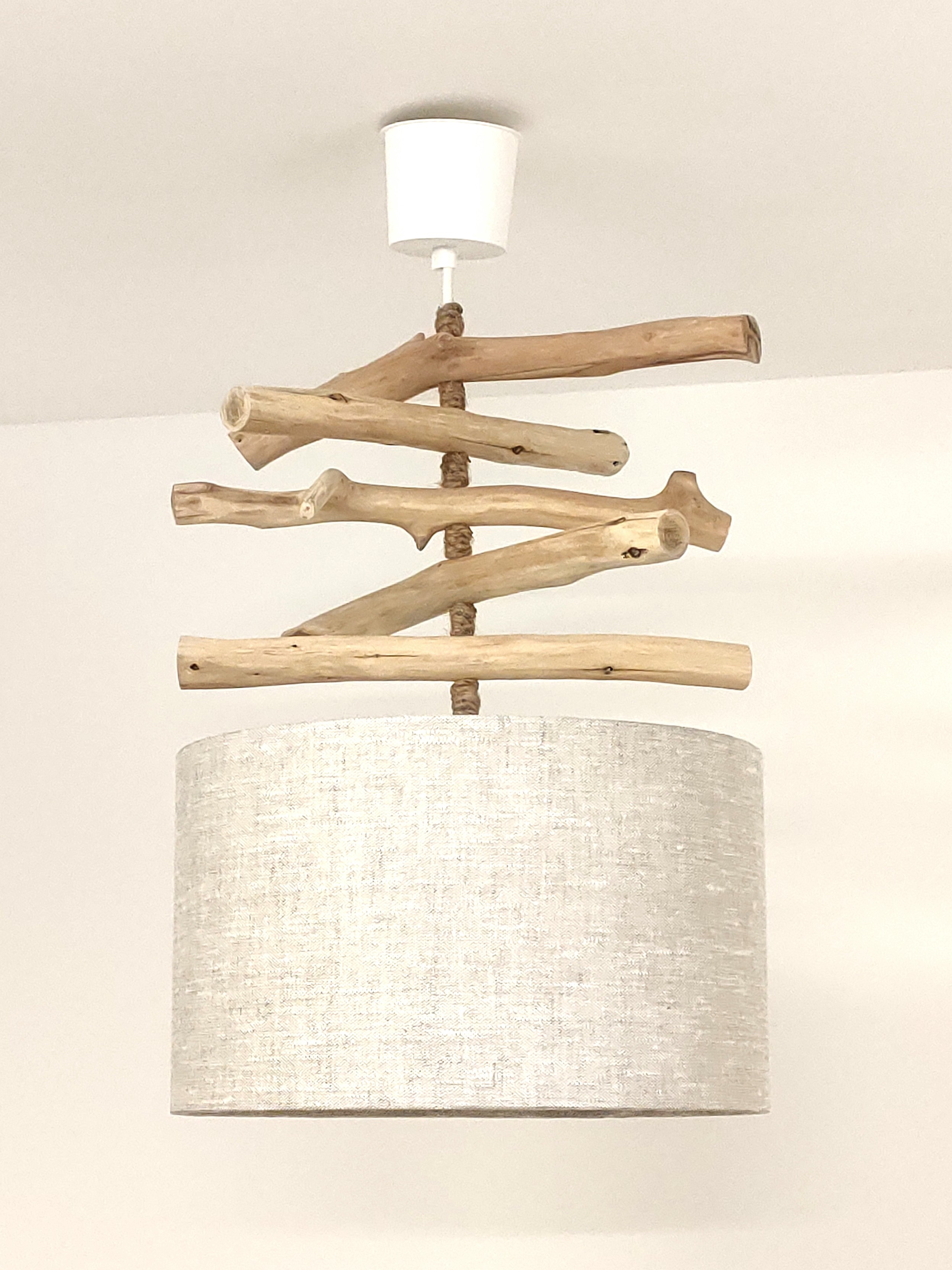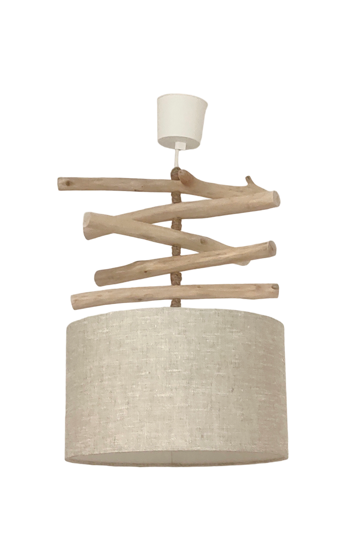 Création Artisanale Française - Lustre en bois flotté avec abat-jour cylindrique.
