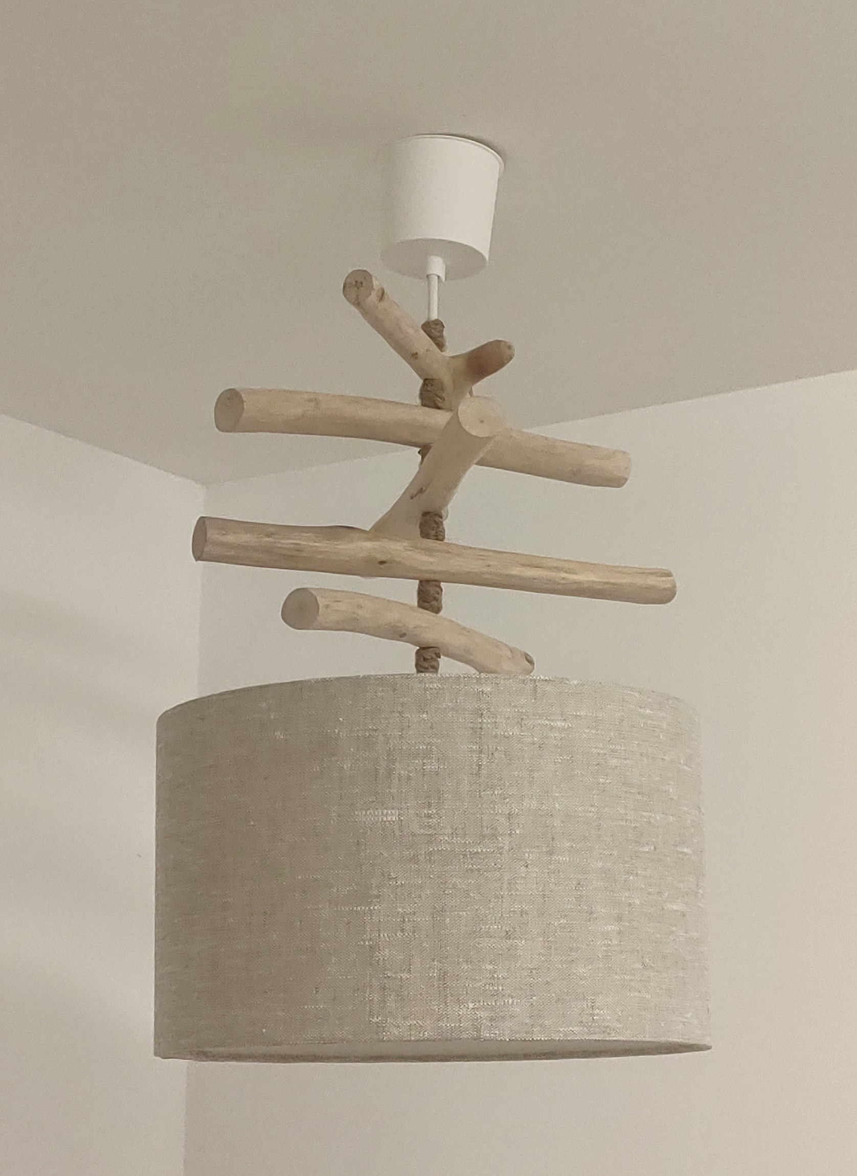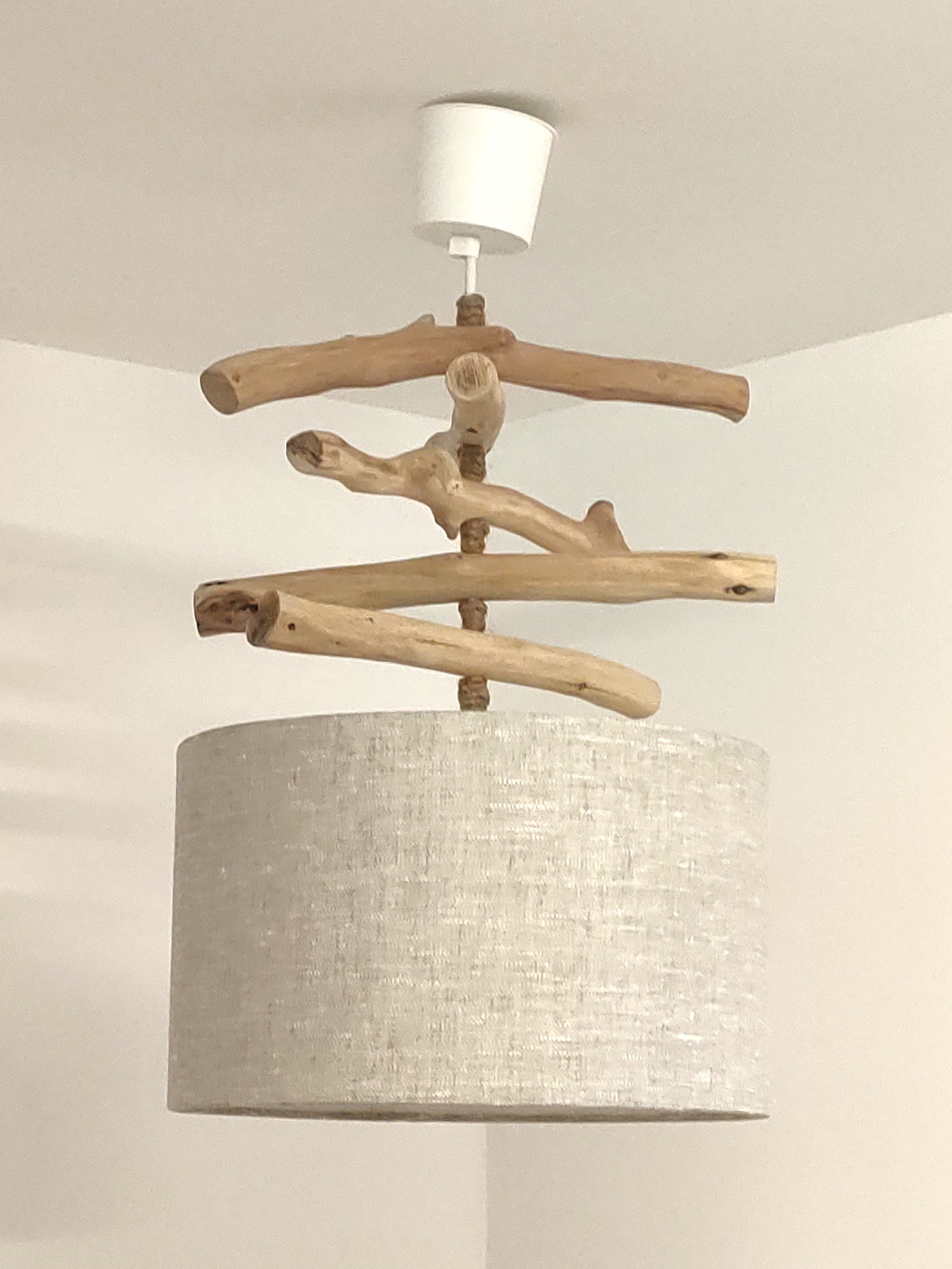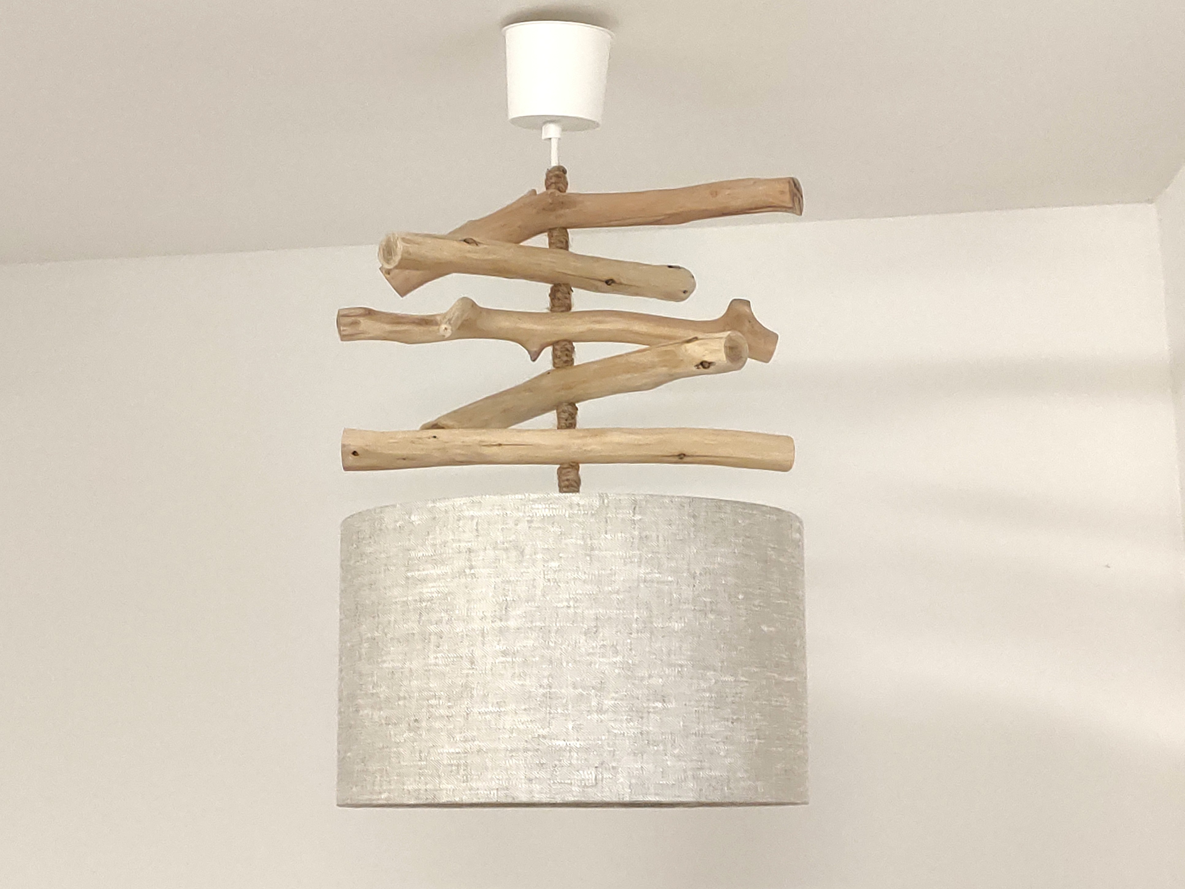 Création Artisanale Française - Lustre en bois flotté avec abat-jour cylindrique.