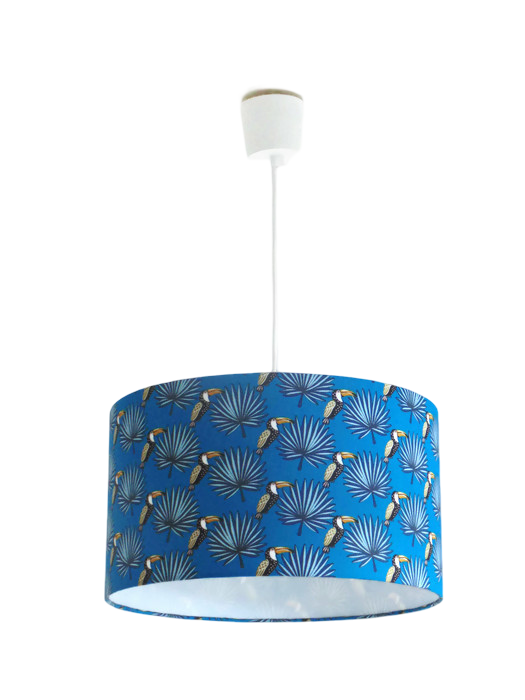 La suspension abat-jour est réalisée à partir d'une carcasse métallique finition époxy blanche recouverte de tissu 100% coton certifié OEKO TEX (sans produit chimique) motifs imprimés toucans contrecollé sur un polyphane ignifugé blanc (PVC non inflammable).