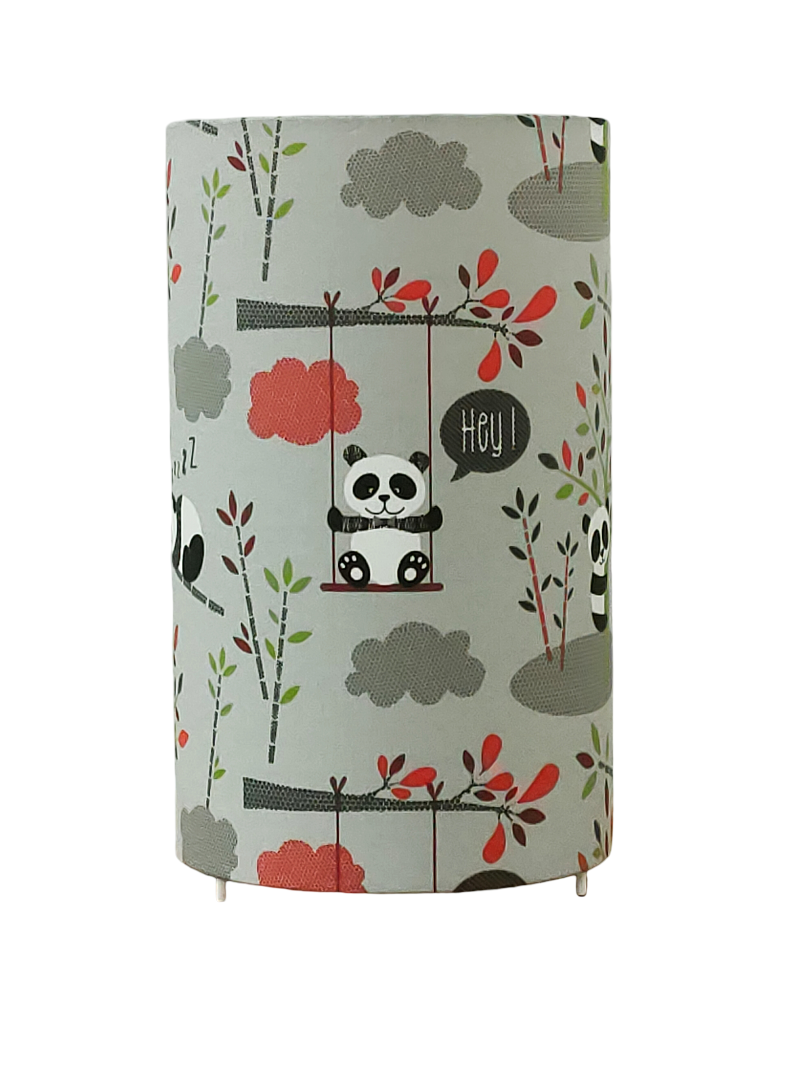 La lampe tube est réalisée à partir d'une carcasse métallique avec pieds finition époxy blanche recouverte de tissu 100% coton certifié OEKO TEX (sans produit chimique) motifs imprimés pandas contrecollé sur un polyphane ignifugé blanc (PVC non inflammable).