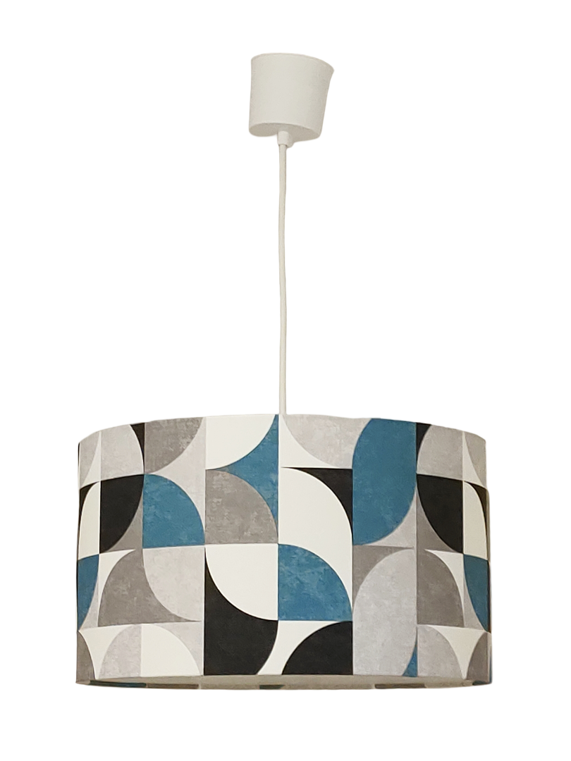 La suspension abat-jour est réalisée à partir d'une carcasse métallique finition époxy blanche recouverte de papier intissé imprimé motifs rétro vintage bleu contrecollé sur un polyphane ignifugé blanc (PVC non inflammable).