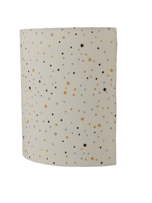 Applique Murale carré coins ronds en tissu blanc motifs étoiles jaunes bleues et violettes entièrement fait main.