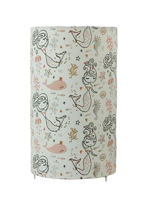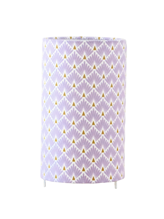 La lampe tube est réalisée à partir d'une carcasse métallique avec pieds finition époxy blanche recouverte de tissu 100% coton certifié OEKO TEX (sans produit chimique) motifs imprimés écailles parme contrecollé sur un polyphane ignifugé blanc (PVC non inflammable).