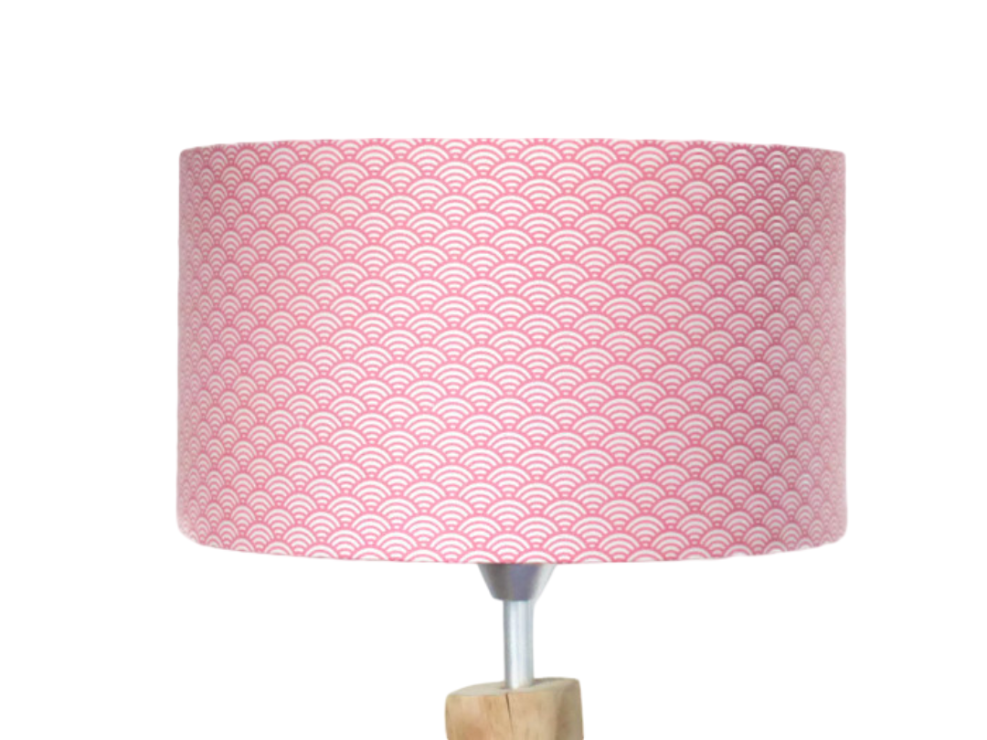 L’abat-jour est réalisé à partir d'une carcasse métallique finition époxy blanche recouverte de tissu 100% coton certifié OEKO TEX (sans produit chimique) motifs imprimés japonais vague seigaiha rose contrecollé sur un polyphane ignifugé blanc (PVC non inflammable).