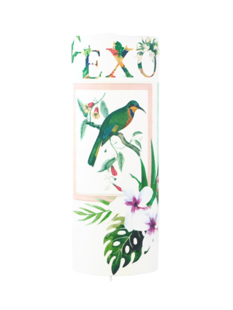 La lampe tube est réalisée à partir d'une carcasse métallique avec pieds finition époxy blanche recouverte de papier intissé aux motifs oiseaux exotiques contrecollé sur un polyphane ignifugé blanc (PVC non inflammable).