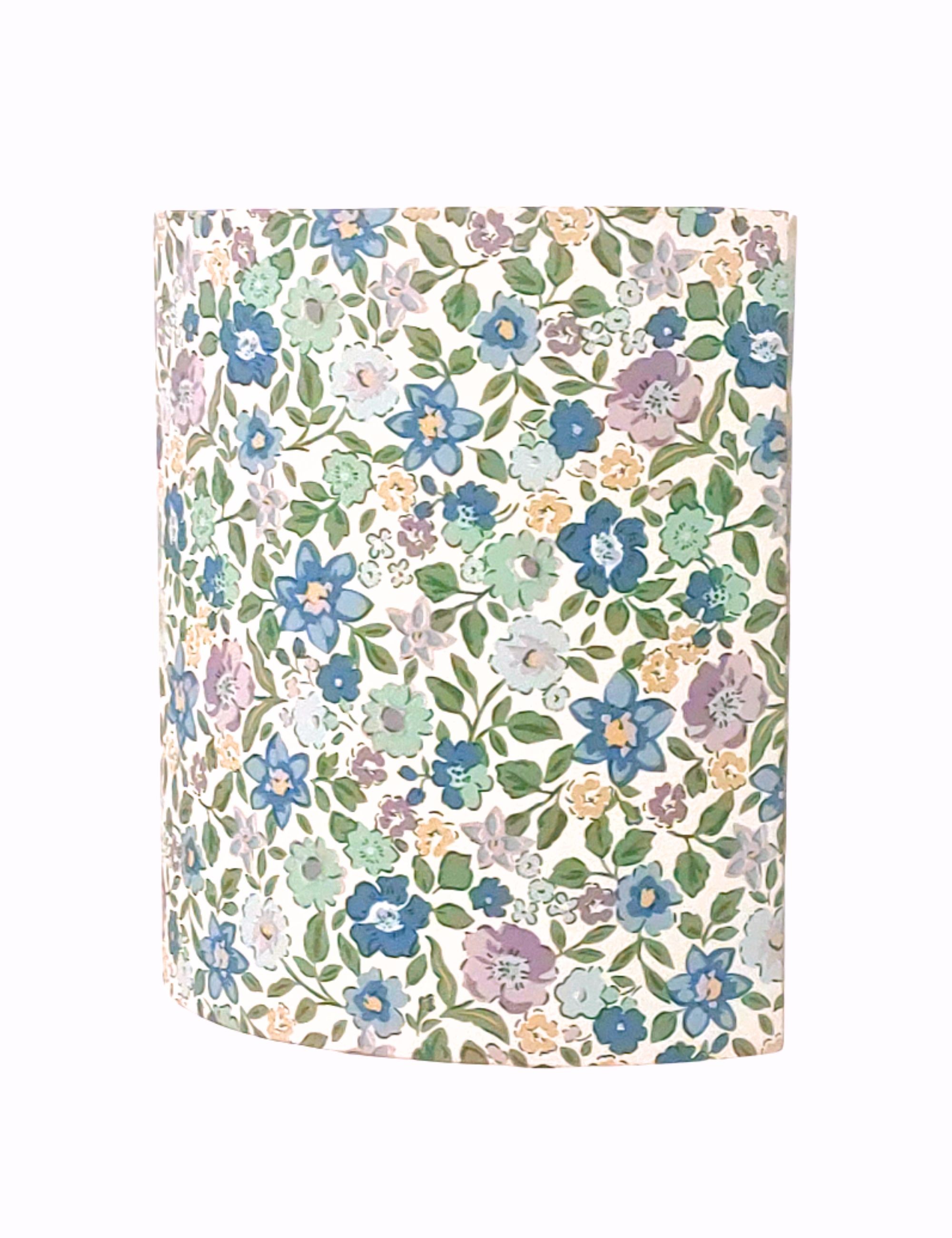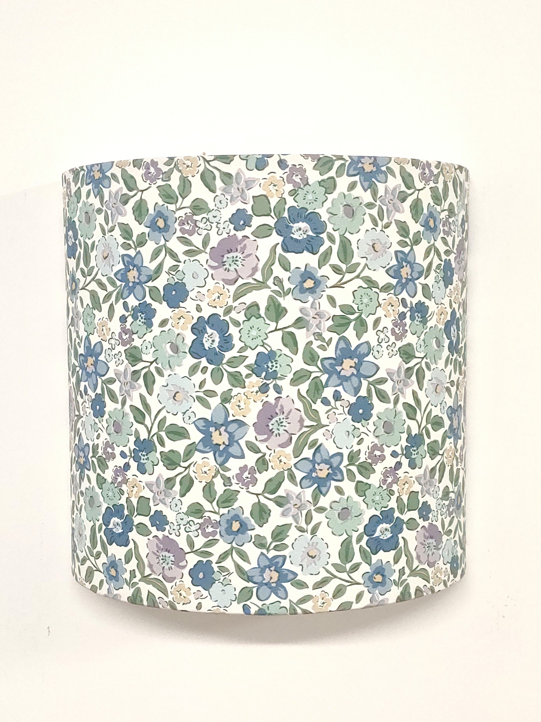 Les Appliques Murales sont réalisées à partir d'une carcasse métallique demi-cylindrique finition peinture époxy blanche recouverte de papier intissé imprimé motifs Liberty - petites fleurs bleues contrecollé sur un polyphane ignifugé blanc (PVC non inflammable).