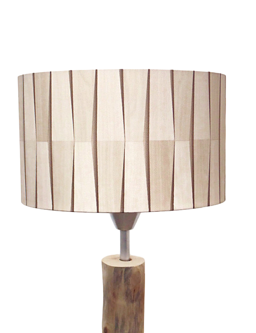 L’abat-jour est réalisé à partir d'une carcasse métallique finition époxy blanche recouverte de papier intissé imprimé motifs bois - Japandi contrecollé sur un polyphane ignifugé blanc (PVC non inflammable).