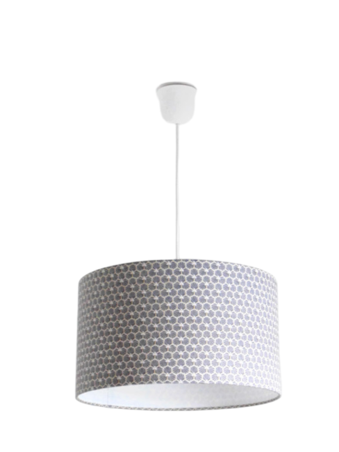 La suspension abat-jour est réalisée à partir d'une carcasse métallique finition époxy blanche recouverte de papier intissé imprimé motifs géométriques gris graphique contrecollé sur un polyphane ignifugé blanc (PVC non inflammable).