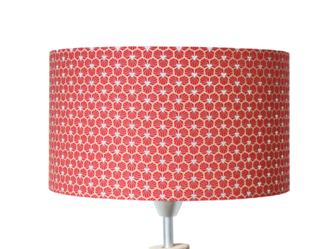 L’abat-jour est réalisé à partir d'une carcasse métallique finition époxy blanche recouverte de tissu 100% coton certifié OEKO TEX (sans produit chimique) motifs imprimés géométrique riad rouge grenadine contrecollé sur un polyphane ignifugé blanc (PVC non inflammable).