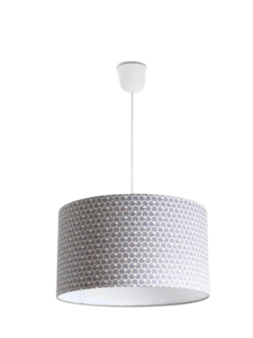 La suspension abat-jour est réalisée à partir d'une carcasse métallique finition époxy blanche recouverte de tissu 100% coton certifié OEKO TEX (sans produit chimique) motifs imprimés géométrique riad gris contrecollé sur un polyphane ignifugé blanc (PVC non inflammable).