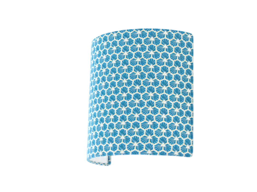 Les Appliques Murales sont réalisées à partir d'une carcasse métallique demi-cylindrique finition peinture époxy blanche recouverte de tissu 100% coton certifié OEKO TEX (sans produit chimique) motifs imprimés géométriques - Riad bleu contrecollé sur un polyphane ignifugé blanc (PVC non inflammable).