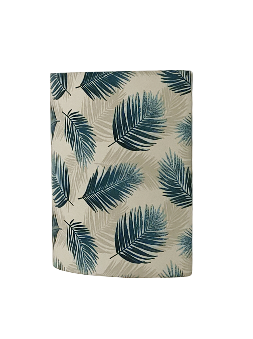 Les Appliques Murales sont réalisées à partir d'une carcasse métallique demi-cylindrique finition peinture époxy blanche recouverte de tissu 100% coton certifié OEKO TEX (sans produit chimique) motifs imprimés feuilles bleues contrecollé sur un polyphane ignifugé blanc (PVC non inflammable).