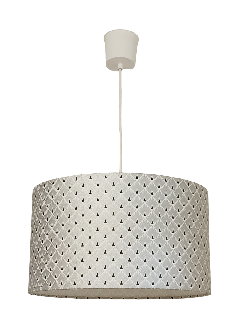La suspension abat-jour est réalisée à partir d'une carcasse métallique finition époxy blanche recouverte de tissu 100% coton certifié OEKO TEX (sans produit chimique) motifs imprimés art déco écailles métallic gris argent contrecollé sur un polyphane ignifugé blanc (PVC non inflammable).