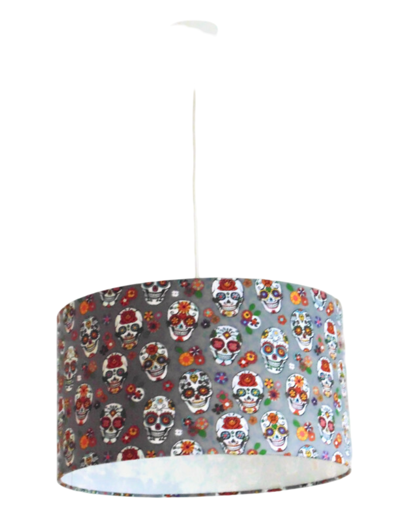 La suspension abat-jour est réalisée à partir d'une carcasse métallique finition époxy blanche recouverte de tissu 100% coton certifié OEKO TEX (sans produit chimique) motifs imprimés calavera contrecollé sur un polyphane ignifugé blanc (PVC non inflammable).