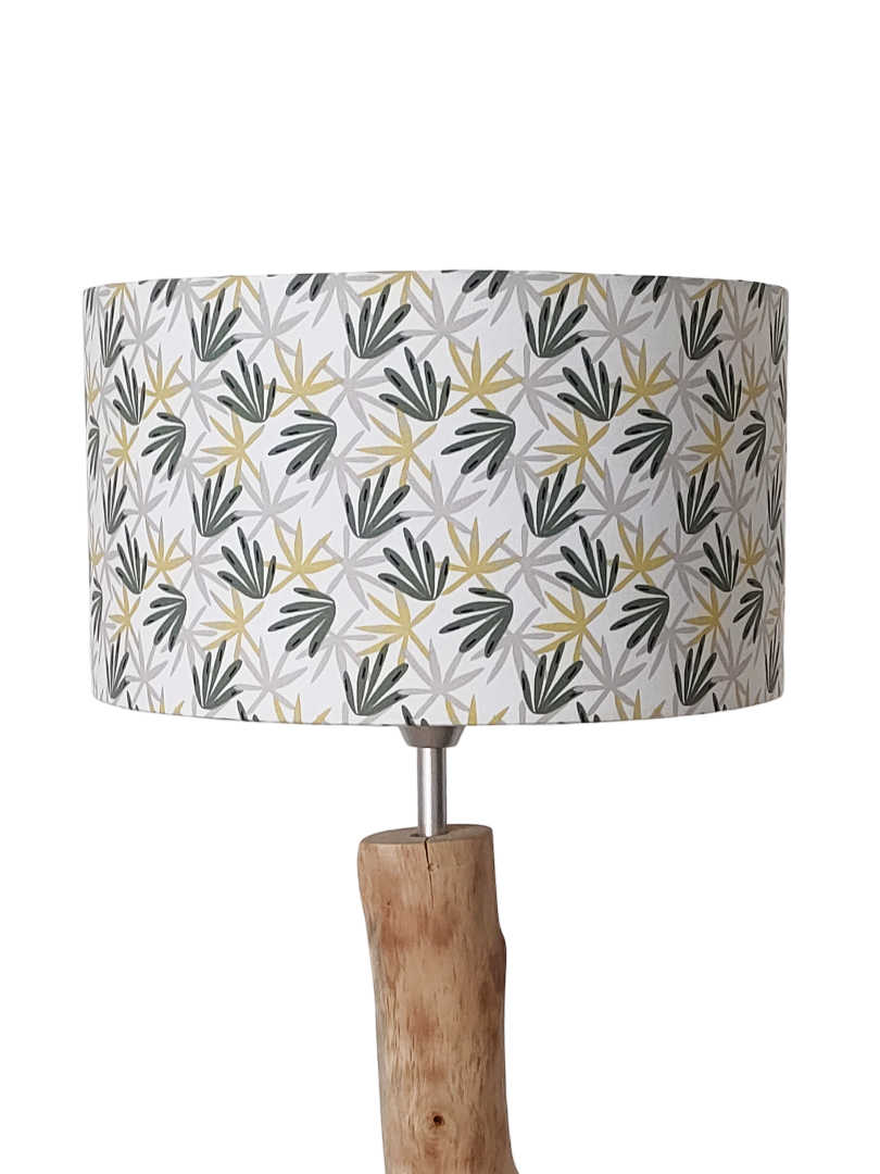 L’abat-jour est réalisé à partir d'une carcasse métallique finition époxy blanche recouverte de tissu 100% coton certifié OEKO TEX (sans produit chimique) motifs imprimés feuillees vertes contrecollé sur un polyphane ignifugé blanc (PVC non inflammable).