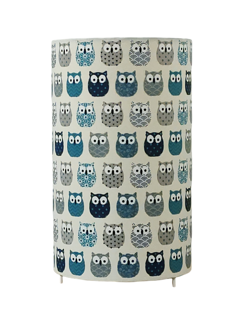 La lampe tube est réalisée à partir d'une carcasse métallique avec pieds finition époxy blanche recouverte de tissu 100% coton certifié OEKO TEX (sans produit chimique) motifs imprimés hiboux contrecollé sur un polyphane ignifugé blanc (PVC non inflammable).