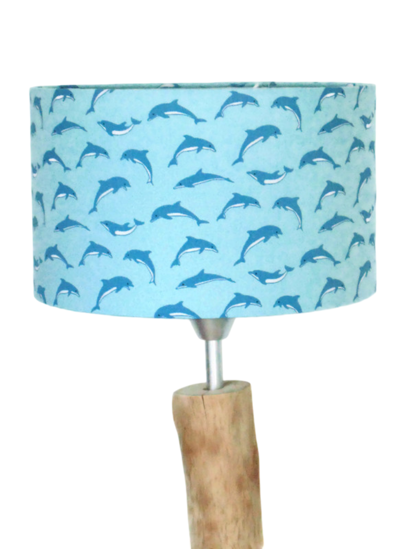 L’abat-jour est réalisé à partir d'une carcasse métallique finition époxy blanche recouverte de tissu 100% coton certifié OEKO TEX (sans produit chimique) motifs imprimés Dauphins contrecollé sur un polyphane ignifugé blanc (PVC non inflammable).