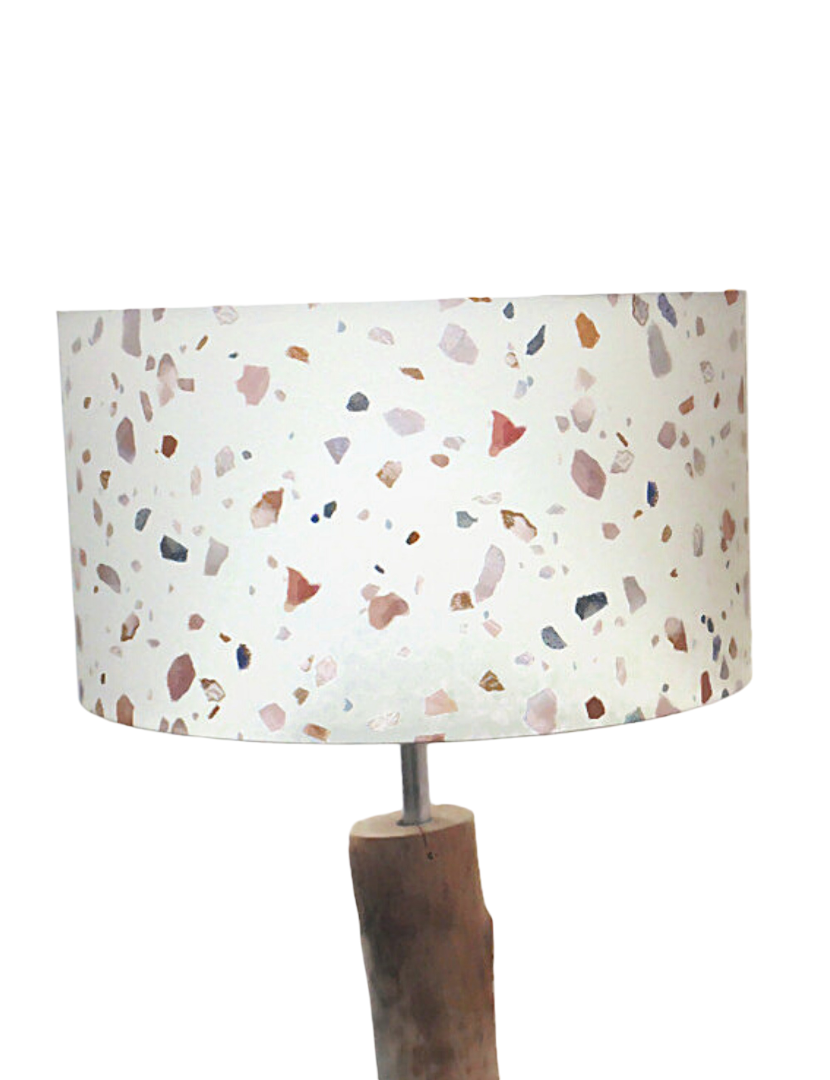 L’abat-jour est réalisé à partir d'une carcasse métallique finition époxy blanche recouverte de papier intissé imprimé motifs Terrazzo contrecollé sur un polyphane ignifugé blanc (PVC non inflammable).
