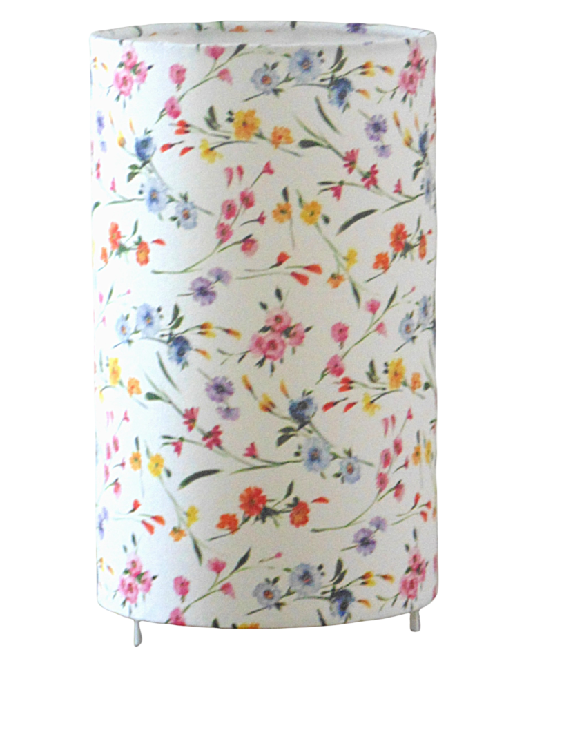 La lampe tube est réalisée à partir d'une carcasse métallique avec pieds finition époxy blanche recouverte de tissu 100% coton certifié OEKO TEX (sans produit chimique) motifs imprimés petites fleurs contrecollé sur un polyphane ignifugé blanc (PVC non inflammable).