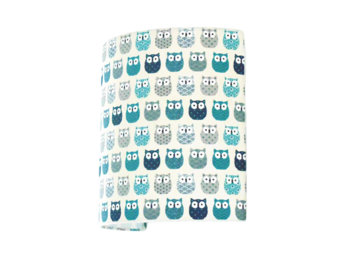 Les Appliques Murales sont réalisées à partir d'une carcasse métallique demi-cylindrique finition peinture époxy blanche recouverte de tissu 100% coton certifié OEKO TEX (sans produit chimique) motifs imprimés Hiboux contrecollé sur un polyphane ignifugé blanc (PVC non inflammable).
