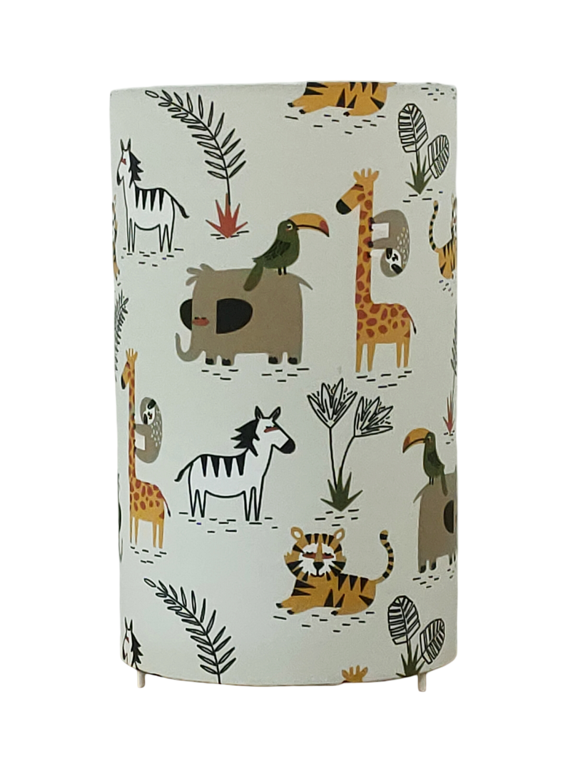 La lampe tube est réalisée à partir d'une carcasse métallique avec pieds finition époxy blanche recouverte de tissu 100% coton certifié OEKO TEX (sans produit chimique) motifs imprimés safari - animaux de la savane contrecollé sur un polyphane ignifugé blanc (PVC non inflammable).